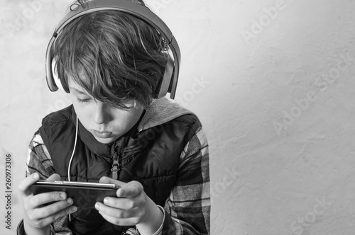 Fashionable Teenager Boy In Headphones And With A Mobile